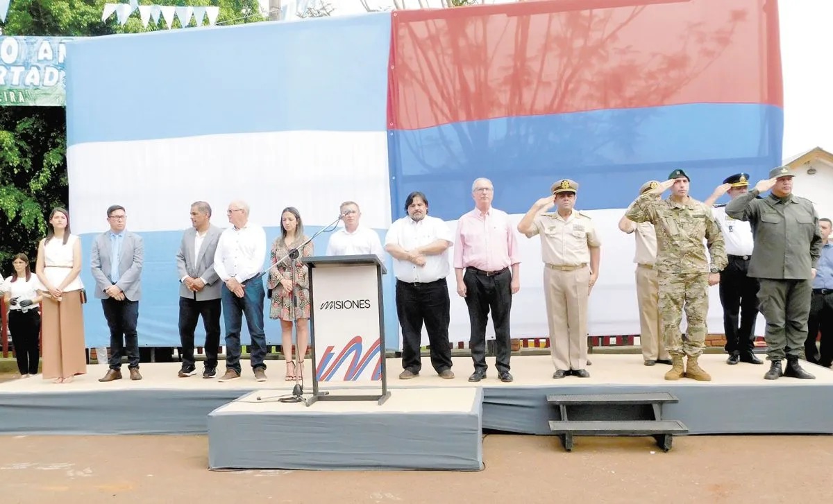El acto central se desarrolló a partir de las 9 en la plaza San Martín y fue encabezado por el intendente municipal Fernando Ferreira y el gobernador de Misiones, Hugo Passalacqua, quien fue declarado Huésped de Honor por el Concejo Deliberante local. Acompañaron la ceremonia la secretaria de Gobierno, Florencia Esquivel; concejales; el cura párroco; los intendentes de Andresito, Bruno Beck; de Wanda, Romina Faccio; y de Puerto Esperanza, Horacio Zarza; el jefe de la Prefectura Puerto Libertad, prefecto Leandro Ulises Leal; y representantes del Ejército Argentino, Gendarmería Nacional y la Policía Provincial.