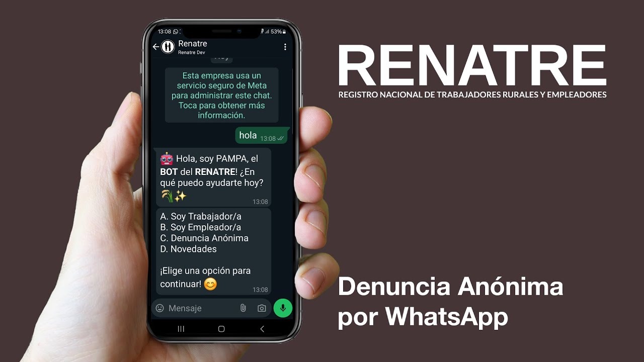 El nuevo servicio se encuentra habilitado a través del BOT PAMPA en el número +54 9 11 2279-0400, que facilita el acceso desde cualquier teléfono móvil. El asistente virtual ofrece diferentes opciones de consulta, entre ellas la posibilidad de realizar una denuncia anónima relacionada con irregularidades laborales en el ámbito rural.