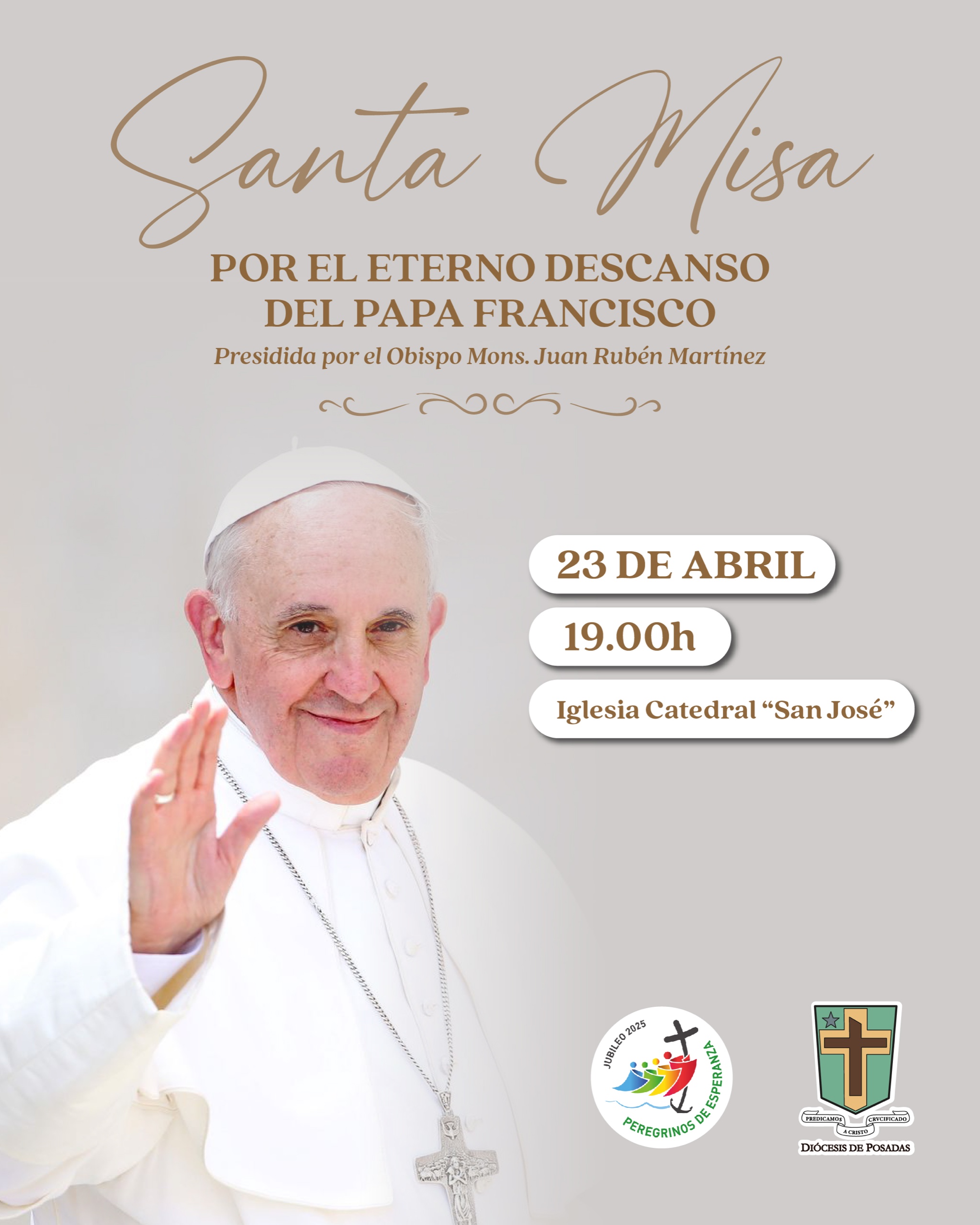 La diócesis de Posadas invita a toda la comunidad a participar de una Santa Misa especial por el eterno descanso del Papa Francisco, recientemente fallecido. La celebración será presidida por el Obispo monseñor Juan Rubén Martínez y se llevará a cabo el miércoles 23 de abril a las 19:00 horas, en la Iglesia Catedral «San José».