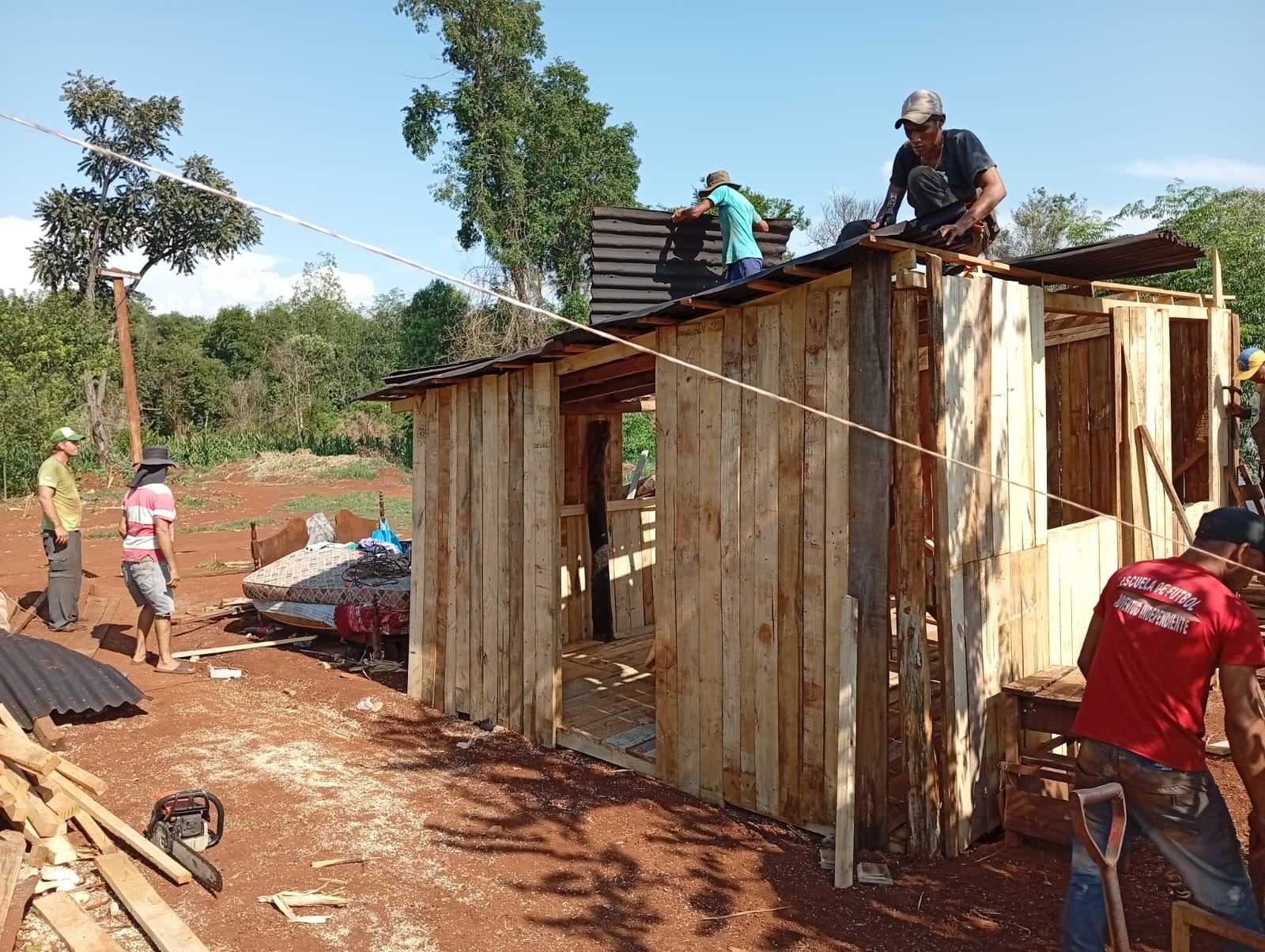 Tras conocer la historia de la familia, Doichele convocó a un grupo de unos veinte jóvenes que participan del proyecto. Con los materiales disponibles y el aporte de algunos comercios de la zona, se organizaron para levantar la vivienda.