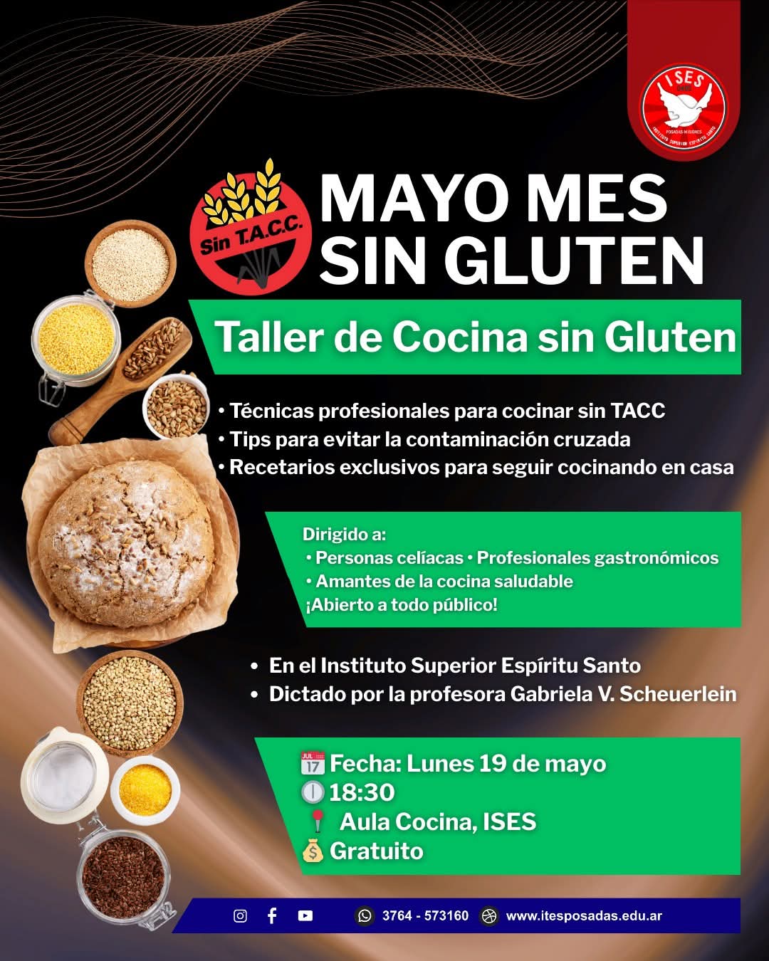En el marco del Mes Sin Gluten, el Instituto Superior Espíritu Santo (ISES) ofrecerá un taller gratuito de cocina sin TACC, a cargo de la profesora Gabriela V. Scheuerlein, especialista en alimentación sin gluten. La propuesta tiene como objetivo generar conciencia sobre la celiaquía y brindar herramientas prácticas para una alimentación segura.