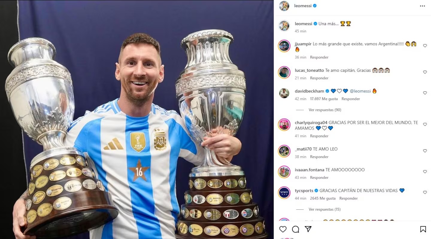 La Pulga, quien debió salir del campo por una lesión en el tobillo derecho durante el segundo tiempo, publicó en Instagram una foto en la que se lo ve con las dos copas de América que ha conquistado junto al equipo nacional. «Una más», escribió Messi en su mensaje, destacando el logro obtenido a pesar de las adversidades.