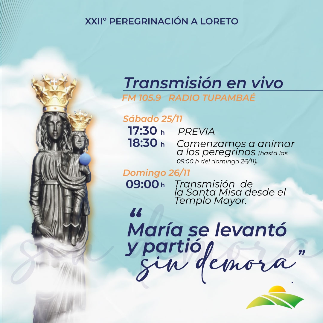 La provincia de Misiones se prepara para dar inicio a la vigésima segunda edición de la Peregrinación a Loreto, una arraigada tradición que comenzará este sábado por la tarde y se extenderá hasta el domingo por la mañana. La experiencia será transmitida en directo por «La Creíble» a través de su frecuencia FM 105.9, así como en las aplicaciones Radio TupaMbaé/Radio Garden y el portal web www.radiotupambae.com.ar.